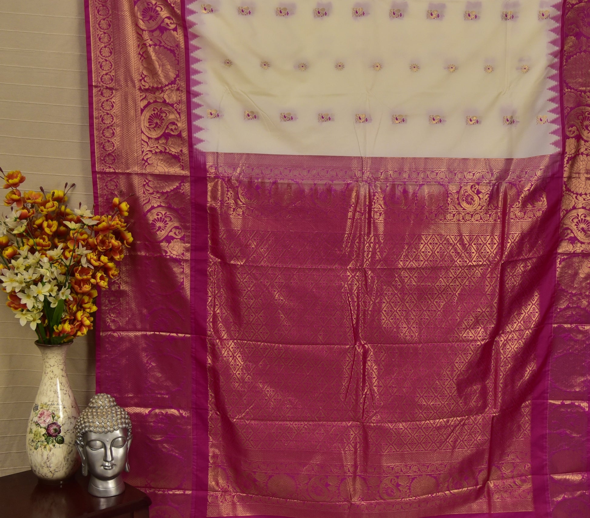 Color: A bright White body beautifully contrasted by a vibrant, deep Pink border and pallu. The true distinction of this saree lies in its intricate Meena (Meenakari) weaving.