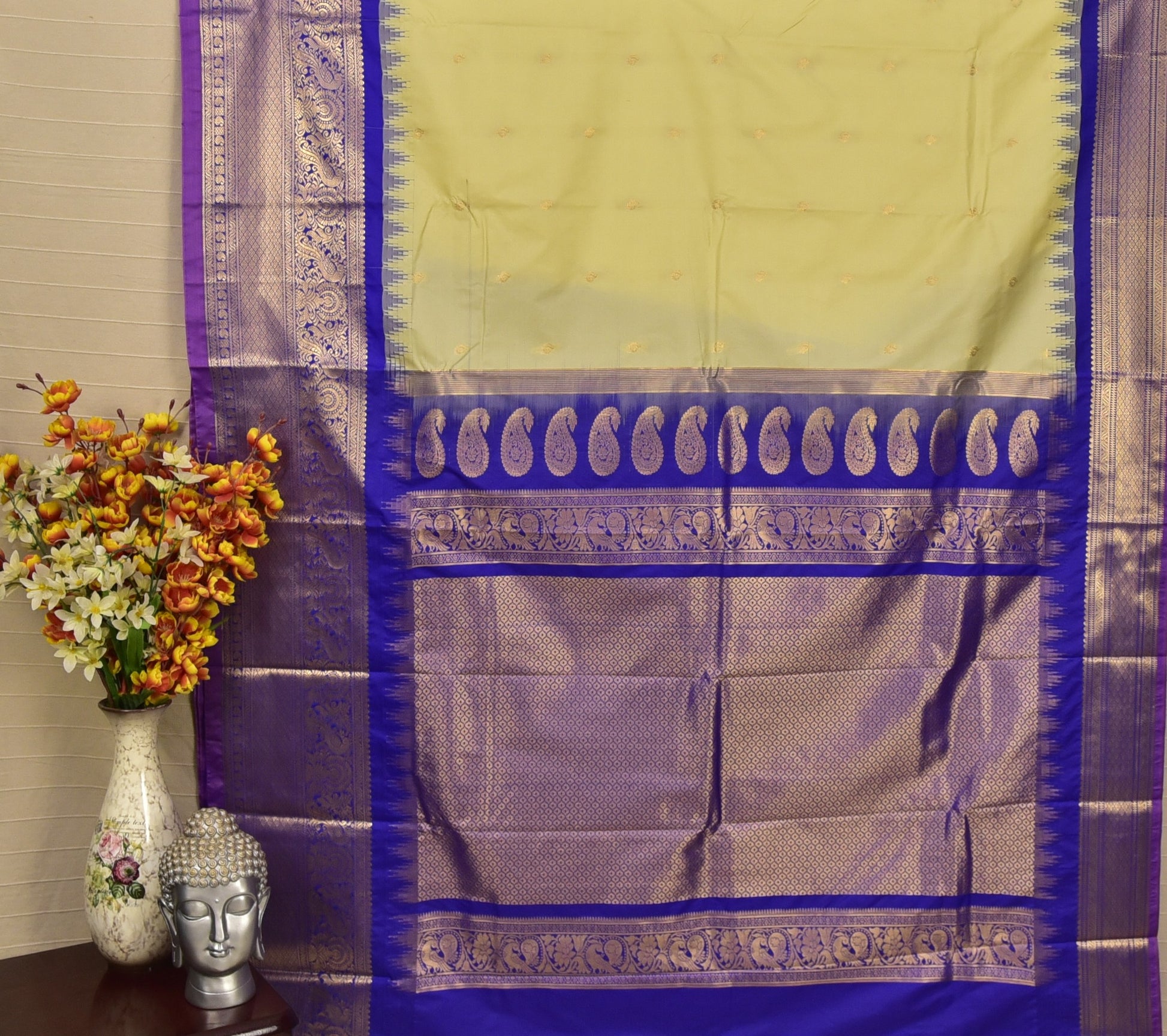 Color: An elegant Cream body beautifully contrasted by a vibrant Royal Blue and gold zari border.