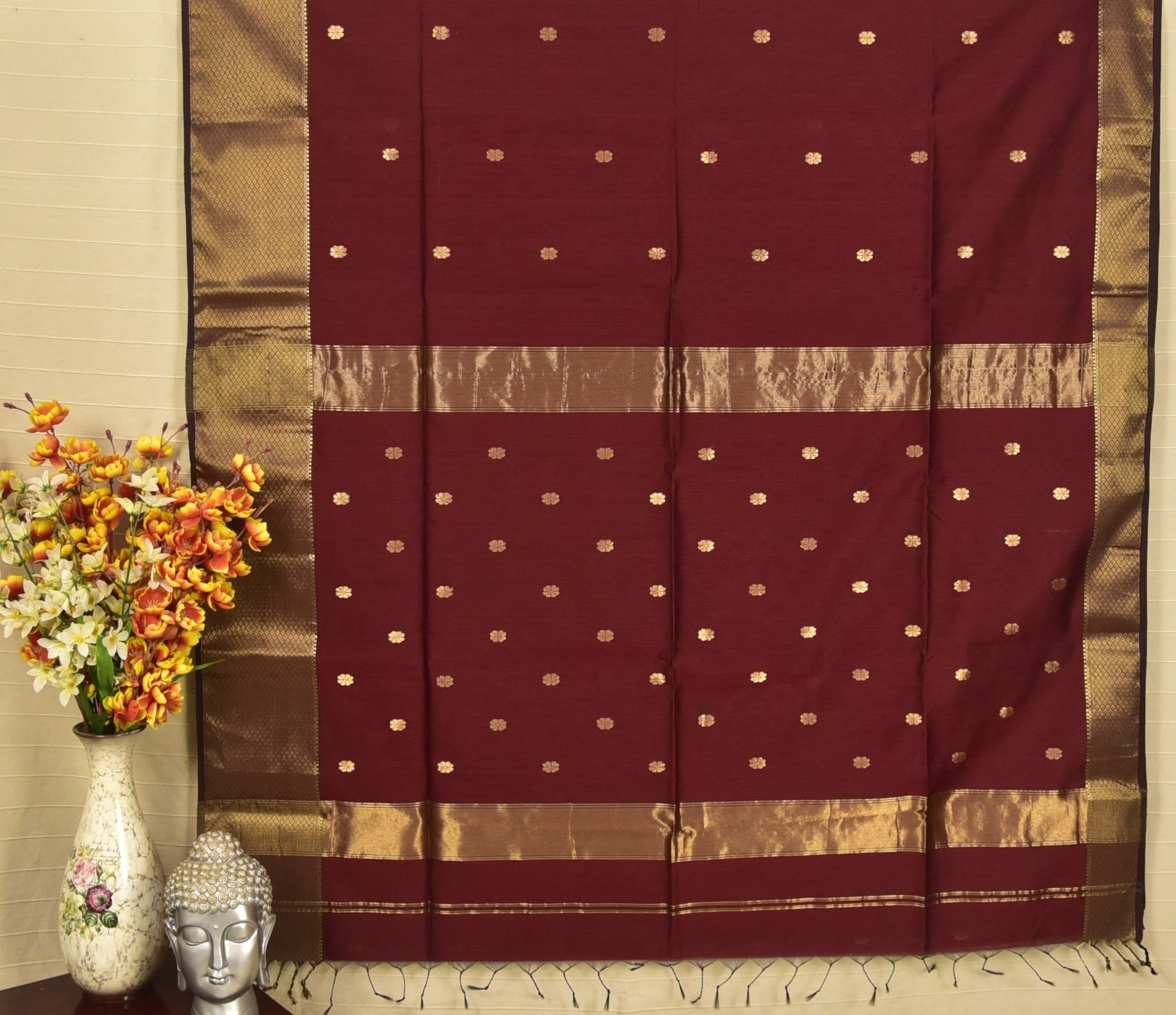 Color: A deeply saturated Imperial Maroon body beautifully offset by shimmering gold zari accents.