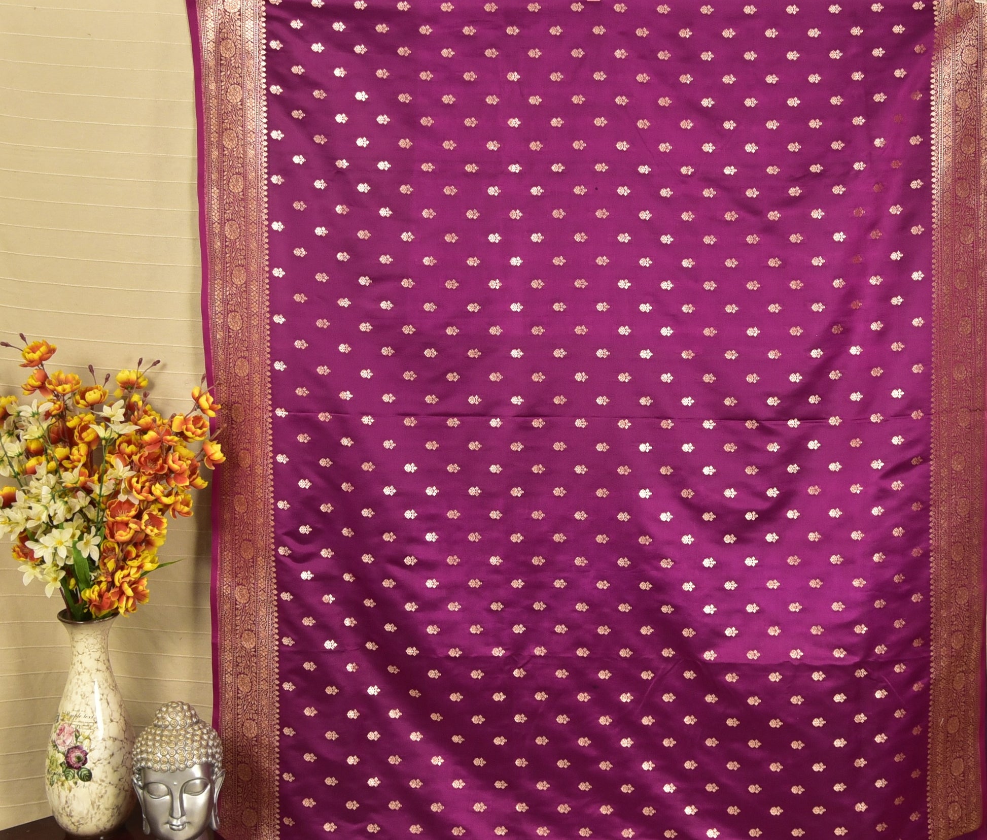 Color: Deep, royal Imperial Purple peppered with delicate gold zari buttis and densely woven gold zari pallu