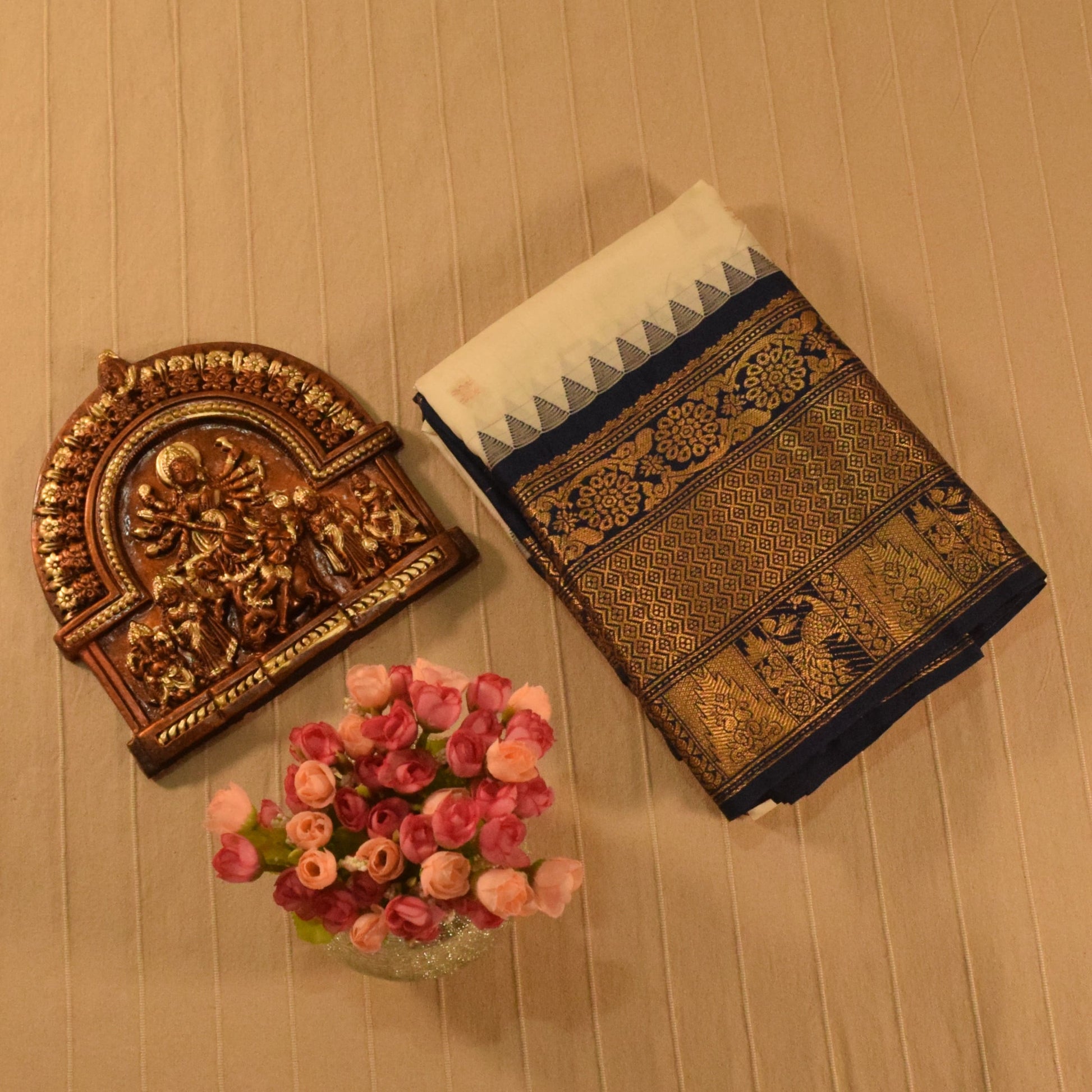 Color: Off-white body with navy blue and gold border and pallu