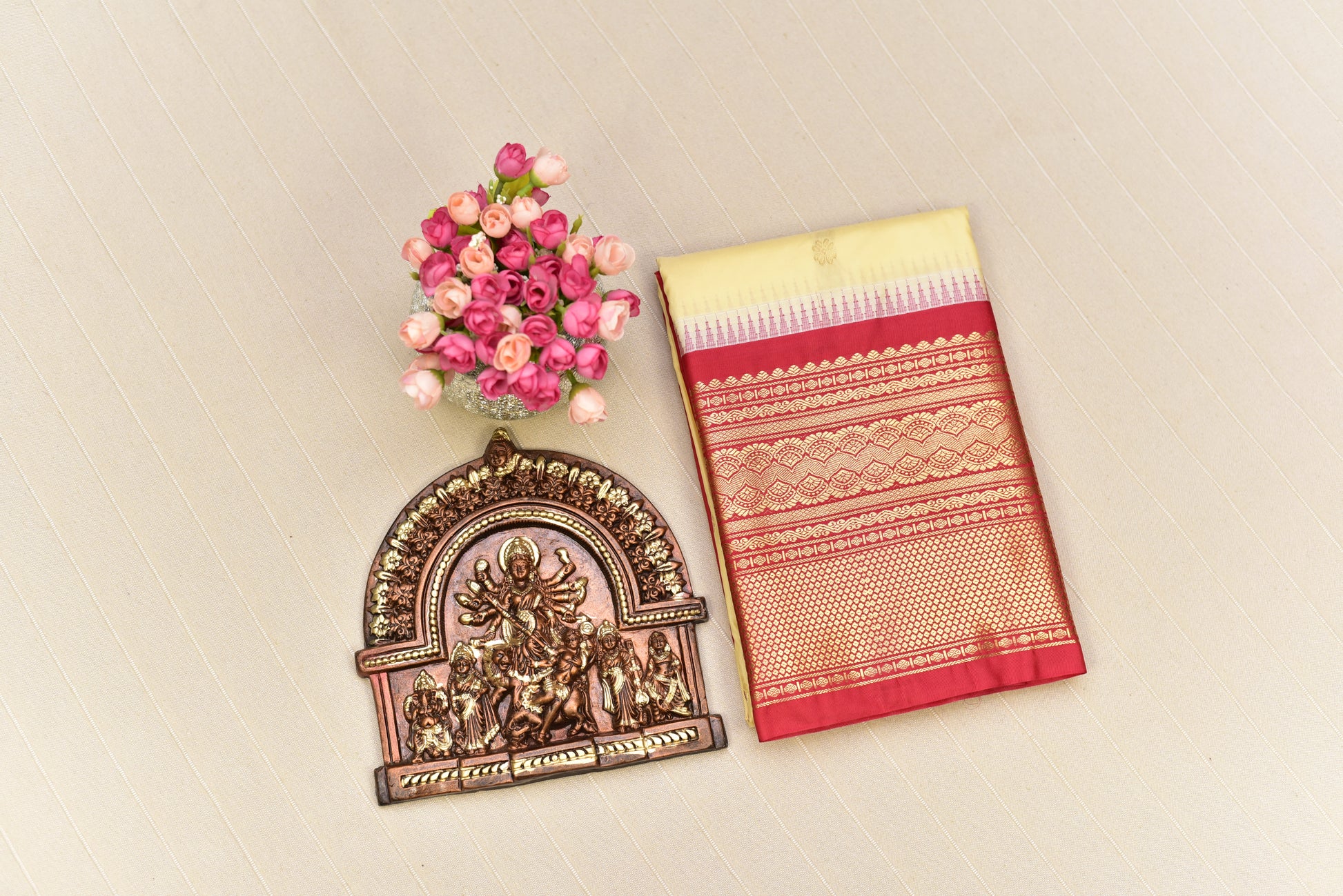 Color: An elegant Cream body beautifully offset by a vibrant Crimson Red contrast border and pallu.