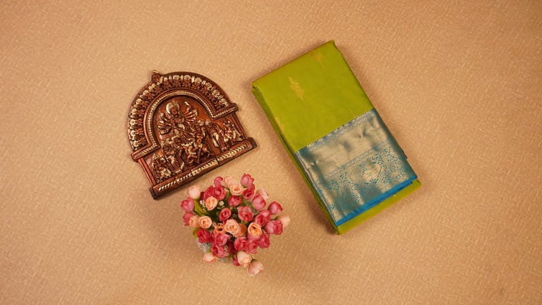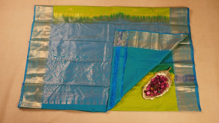 Elevate your occasion wear with this stunning green silk saree, showcasing an exquisite blue and silver woven border for an elegant touch. Crafted from premium silk, this saree offers a luxurious feel and radiant sheen, making it ideal for weddings, festive gatherings, or special celebrations. Its rich green hue complements a variety of complexions, while the vibrant border adds a sophisticated accent to your look. Perfect for those who appreciate timeless style and high-quality craftsmanship.