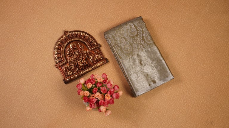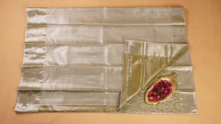 Experience timeless elegance with this Tissue Silk Saree, masterfully woven to showcase delicate floral motifs across its lustrous surface. The primary color is a sophisticated silvery-green or pale olive-gold, giving it an opulent and antique metallic finish. It is framed by a wide, richly woven border in a high-sheen zari, which complements the body of the saree and adds a sense of traditional grandeur.