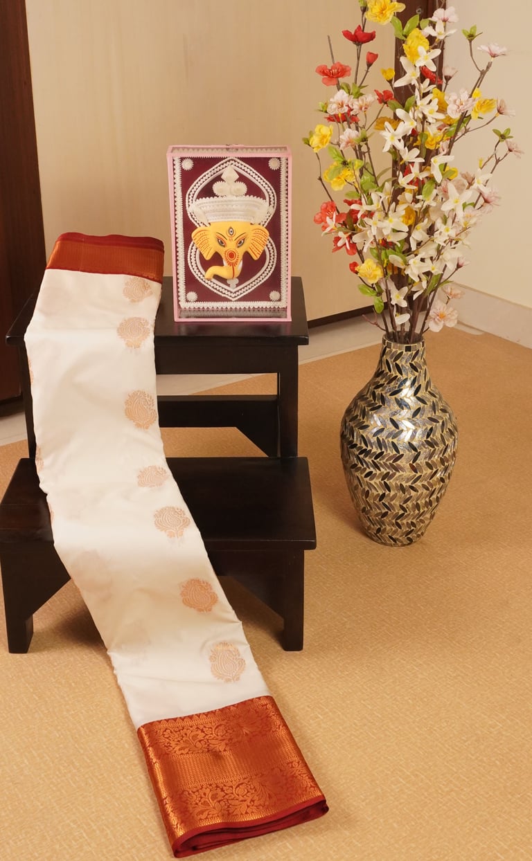 White and Red Semi Kanchivaram Silk Saree