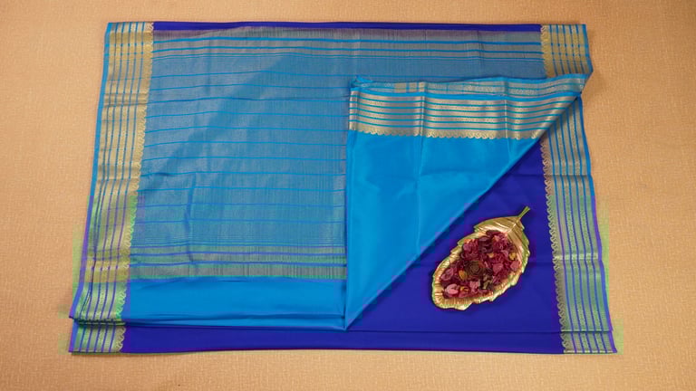 Elevate your festive look with this exquisite royal blue mysore silk saree, beautifully adorned with contrasting shade of bright turquoise blue and classic horizontal stripes of gold zari. Crafted from luxurious silk, this saree offers a rich texture and radiant sheen, perfect for weddings and special celebrations. The vibrant royal blue hue complements all skin tones, while the elegant gold detailing adds a touch of regal charm.