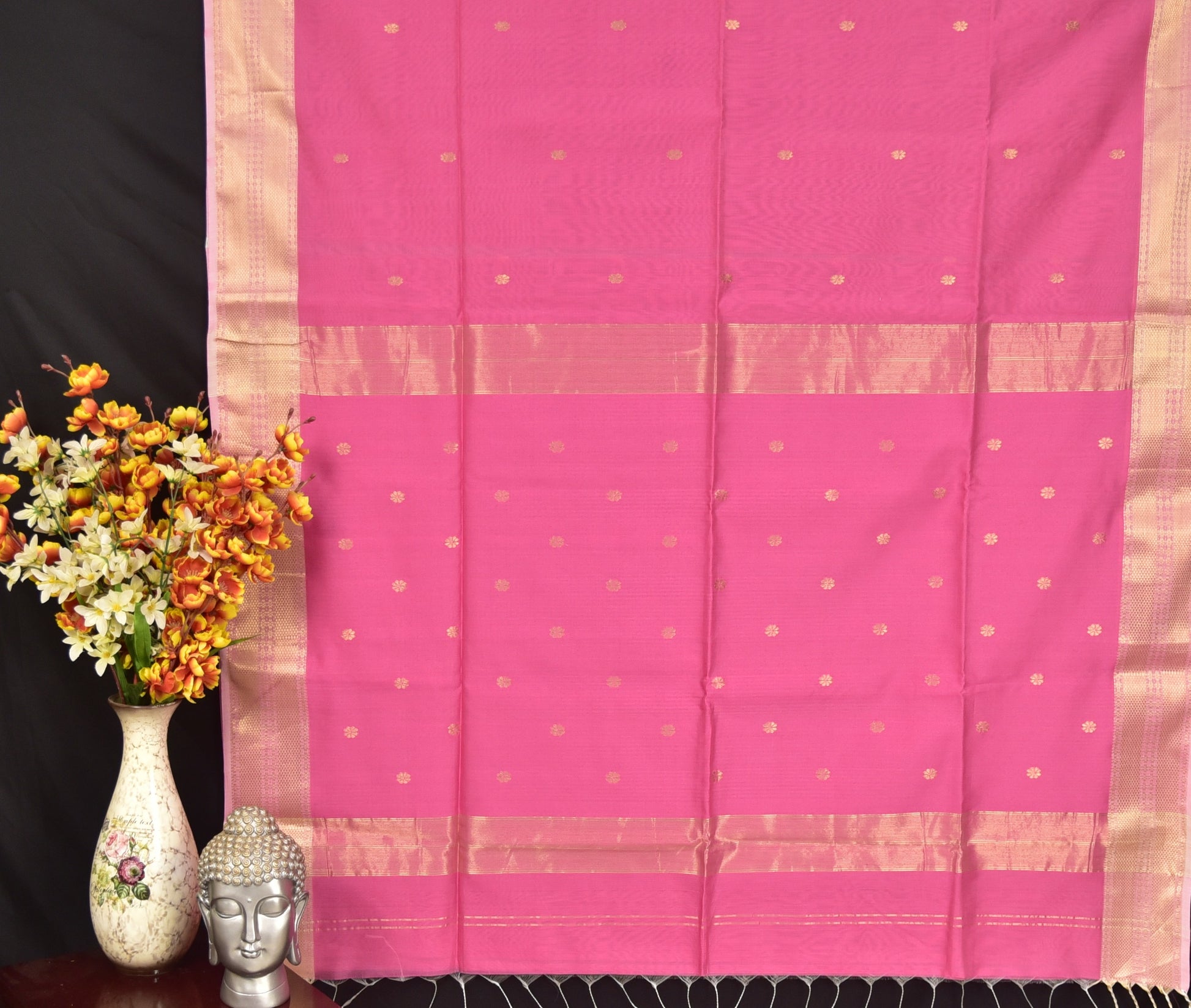 The saree is delicately adorned with small gold zari floral buttis, scattered across the pink canvas to provide a subtle, elegant shimmer.